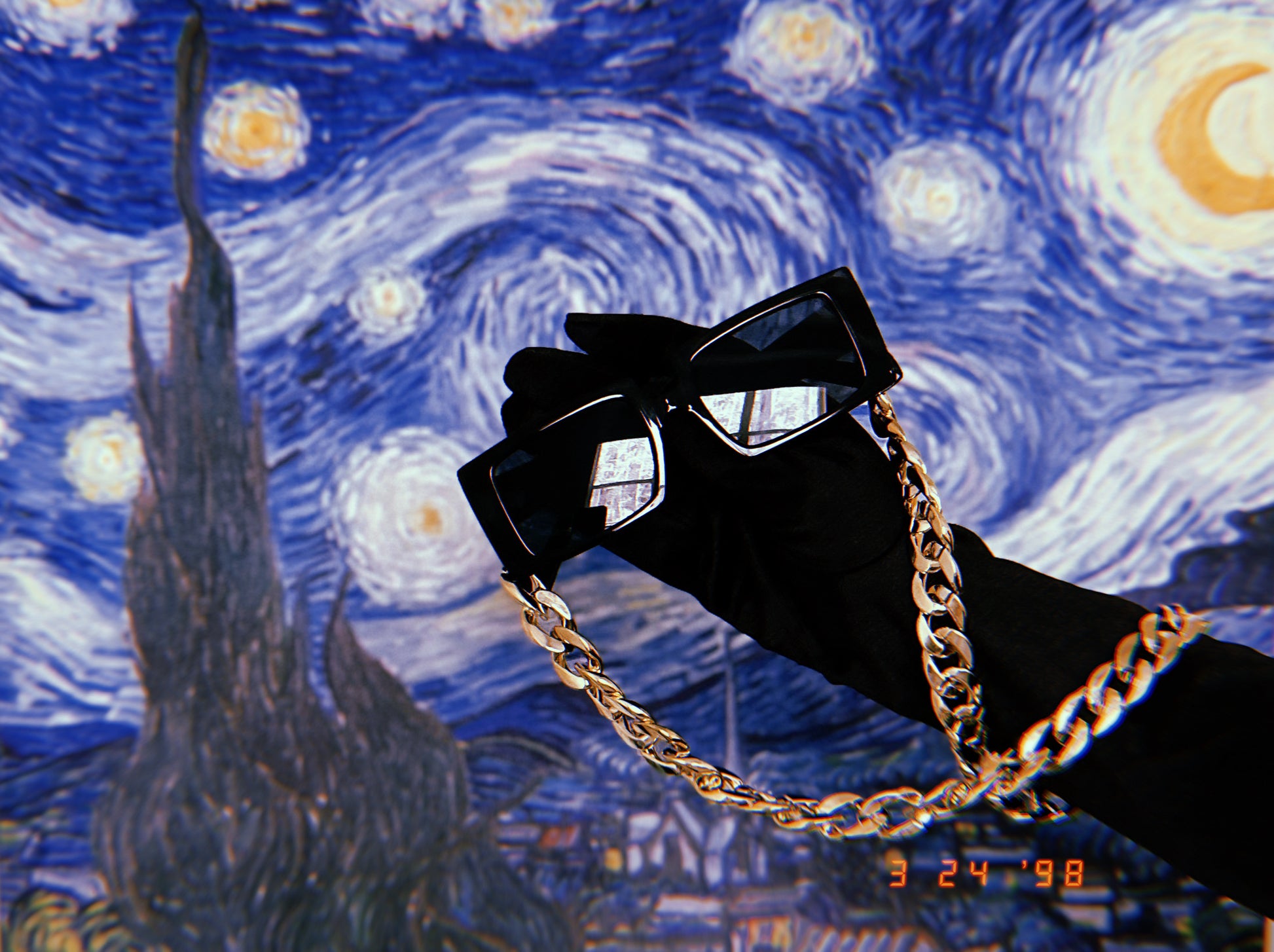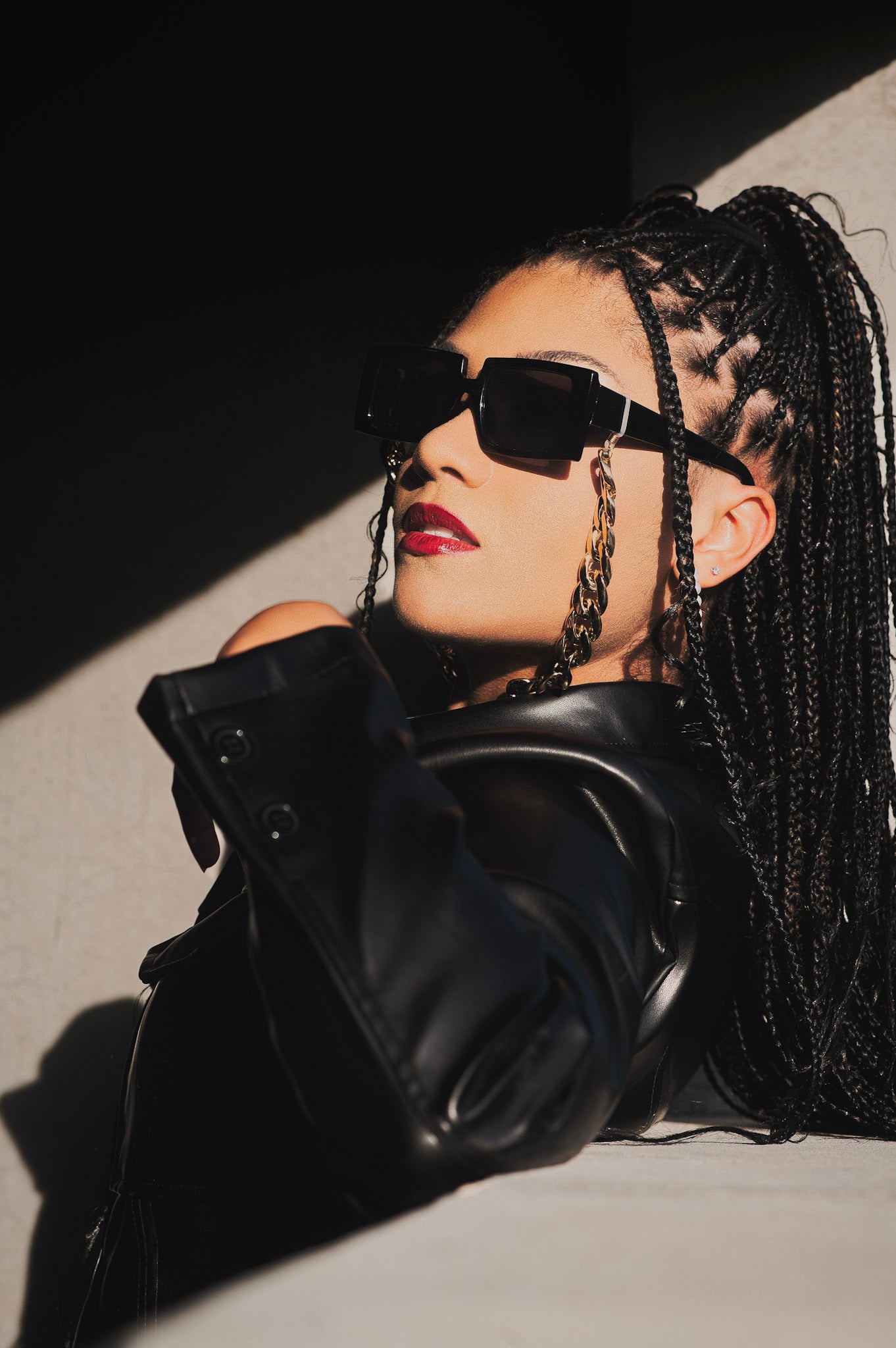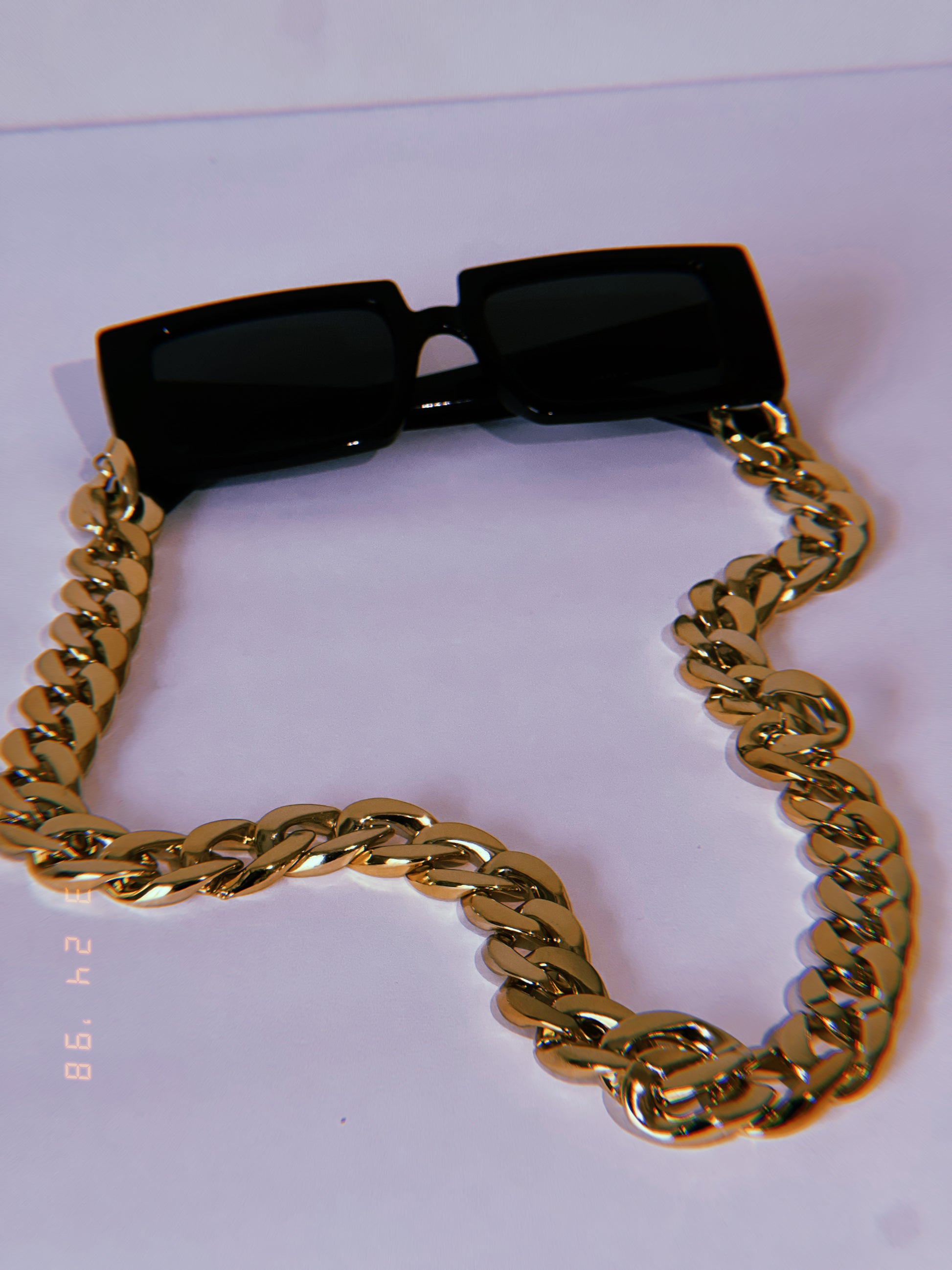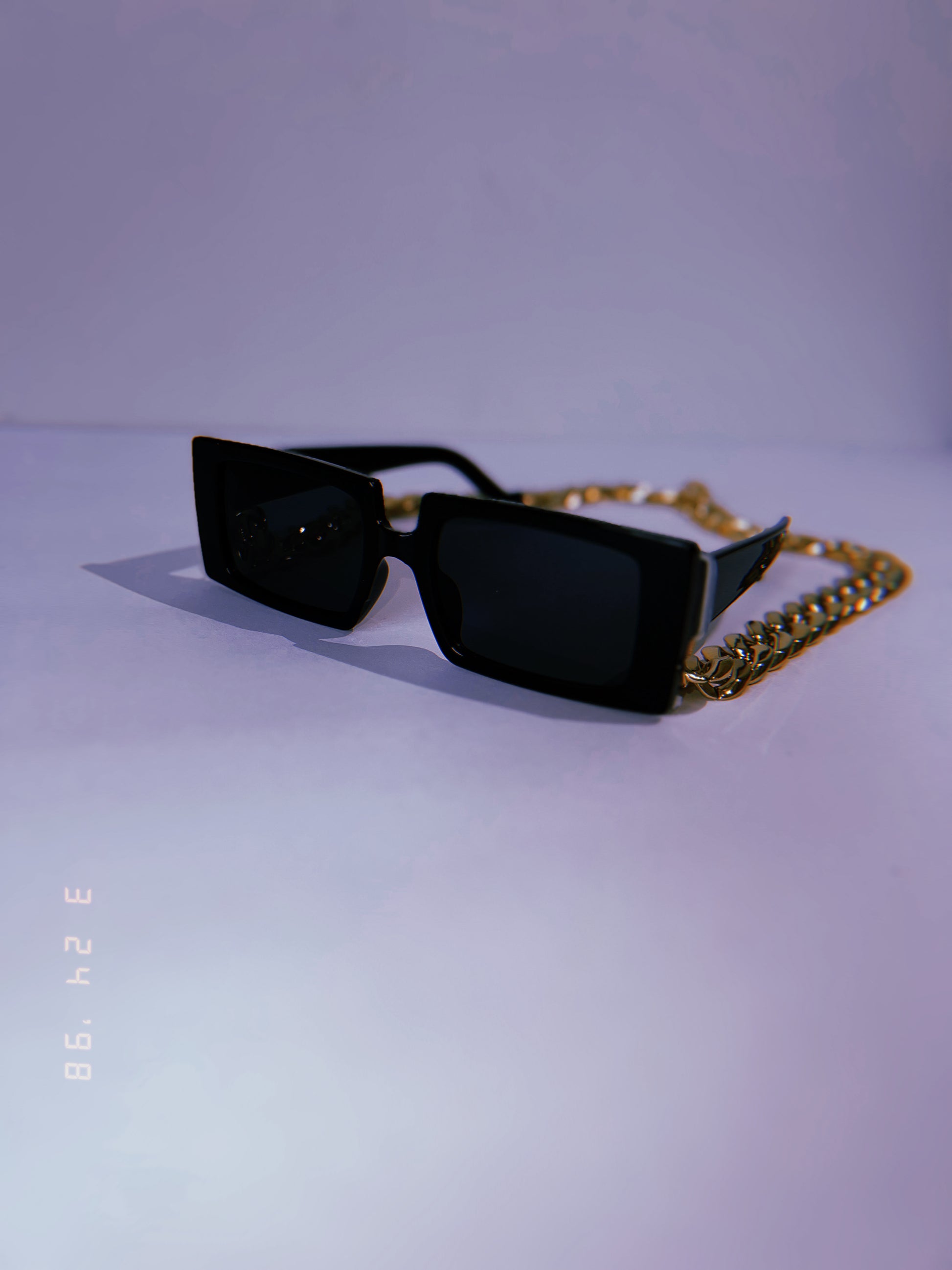 Carefully crafted, Urban Radiance, is a jet-black glamorous chic style. Stylish-tinted black lenses and a striking gold link chain.